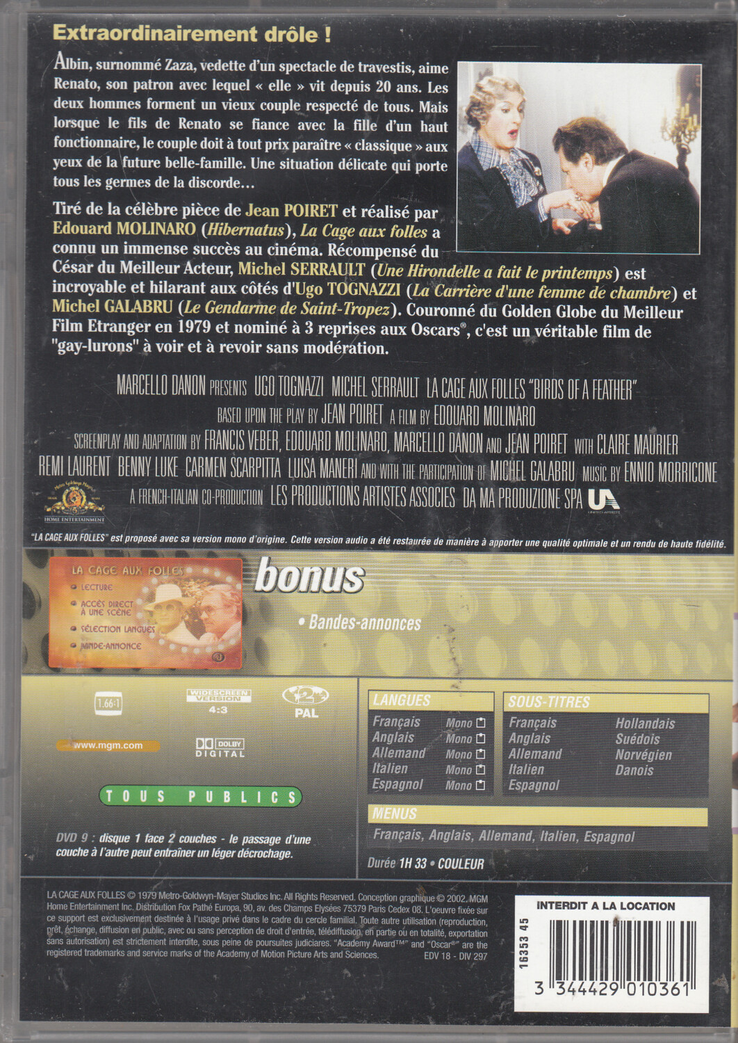 | Titolo: | La Cage Aux Folles con Ugo Tognazzi. DVD Edizione Francia PAL Regione 2, Lingua Francese |