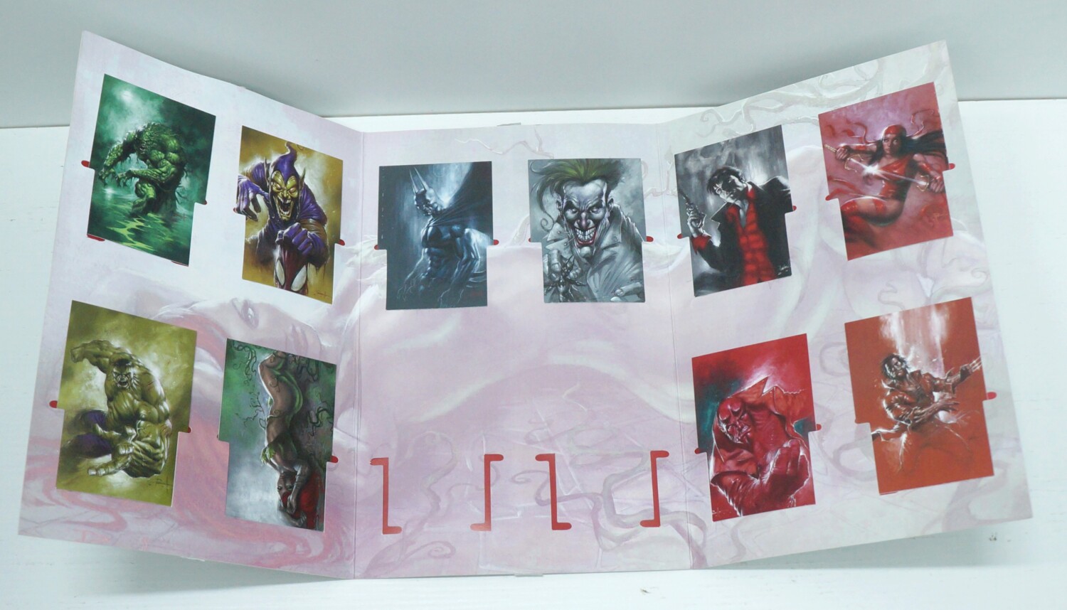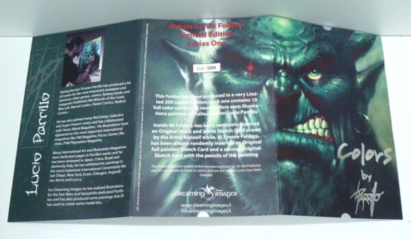 Ogni cartella contiene 10 figurine, all’interno di 46 cartelle è stata inserita in modo casuale un cartoncino originale in bianco e nero disegnato dallo stesso artista mentre, in altre 5 cartelle, è stato sempre inserito casualmente un cartoncino originale interamente dipinto e un secondo cartoncino originale con le matite del dipinto. Questa cartella è stata prodotta in un’edizione molto limitata di 200 copie, ognuna contiene 10 carte a colori con illustrazioni mai viste prima dipinte dal maestro italiano Lucio Parrillo. Ogni cartella è numerata. Le cartelline sono state sigillate prima di numerarle quindi, anche per l’editore, è impossibile sapere in quali di esse siano state inserite le sketch card. |