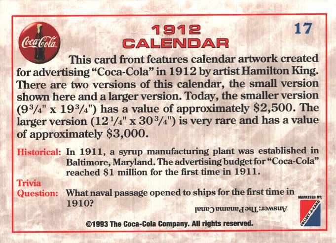 | Titolo: | Card Coca-Cola USA n. 17 – 1912 Calendar – Trivia Card 1993 ed. Marketed |