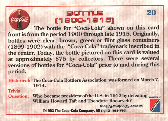 | Titolo: | Card Coca-Cola USA n. 20 – Bottle (1900-1915) 1914 – Trivia Card 1993 ed. Marketed |