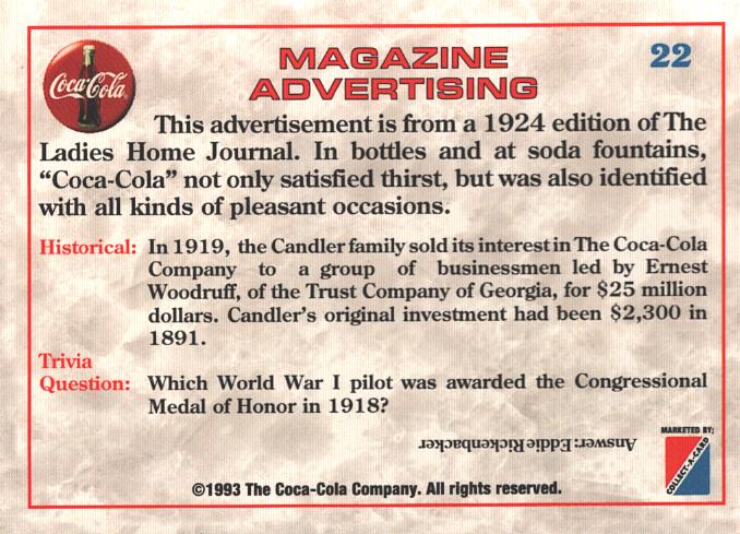 | Titolo: | Card Coca-Cola USA n. 22 – Magazine Advertising 1924 – Trivia Card 1993 ed. Marketed |