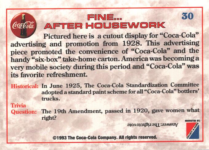| Titolo: | Card Coca-Cola USA n. 30 – Fine after housework 1928 – Trivia Card 1993 ed. Marketed |