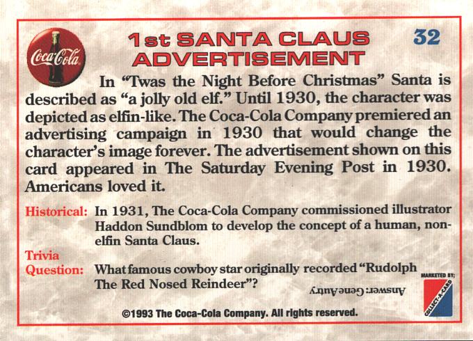 | Titolo: | Card Coca-Cola USA n. 32 – 1st Santa Claus Advertisement 1930 – Trivia Card 1993 ed. Marketed |