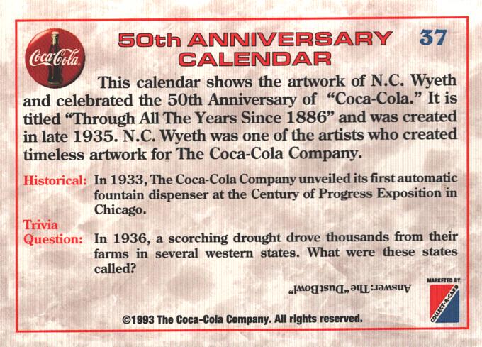 | Titolo: | Card Coca-Cola USA n. 37 – 50th Anniversary Calendar 1936 – Trivia Card 1993 ed. Marketed |