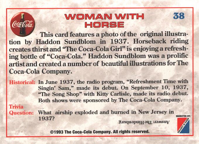 Card Coca-Cola USA n. 38 – Woman with horse 1937 – Trivia Card 1993 ed. Marketed