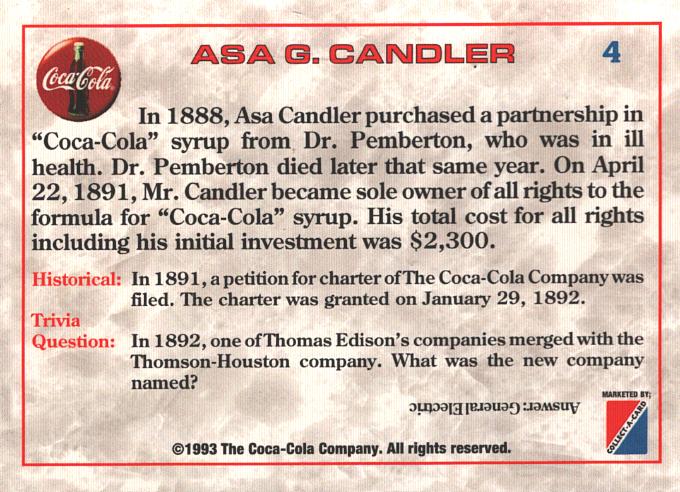 | Titolo: | Card Coca-Cola USA n. 4 – Asa G. Candler 1891 – Trivia Card 1993 ed. Marketed |