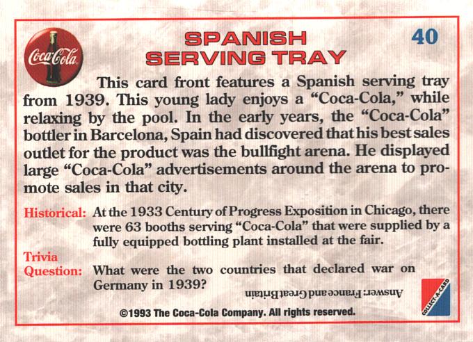 | Titolo: | Card Coca-Cola USA n. 40 – Spanish Serving Tray 1939 – Trivia Card 1993 ed. Marketed |