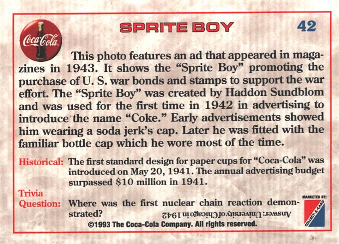 | Titolo: | Card Coca-Cola USA n. 42 – Sprite Boy 1943 – Trivia Card 1993 ed. Marketed |