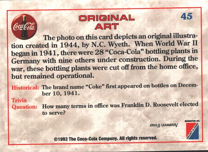 | Titolo: | Card Coca-Cola USA n. 45 – Original Art 1944 – Trivia Card 1993 ed. Marketed |