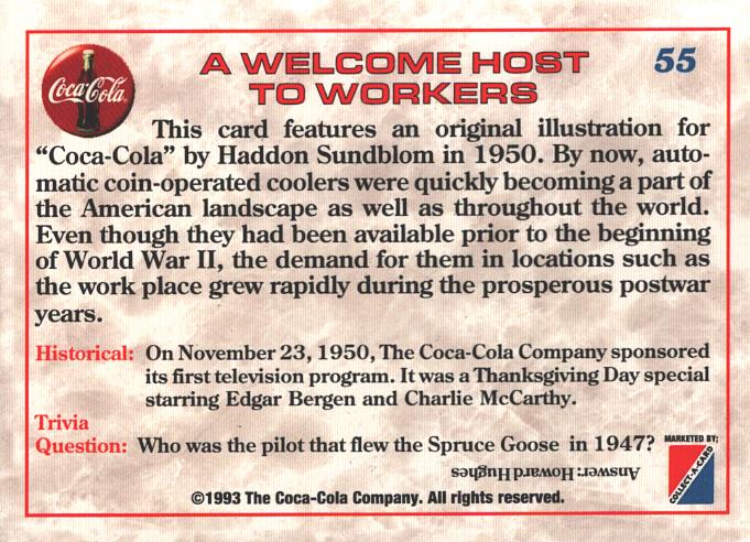 Card Coca-Cola USA n. 55 – A welcome host to workers 1950 – Trivia Card 1993 ed. Marketed