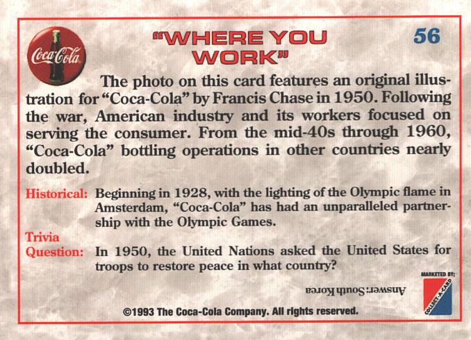 | Titolo: | Card Coca-Cola USA n. 56 – Where you Work 1950 – Trivia Card 1993 ed. Marketed |