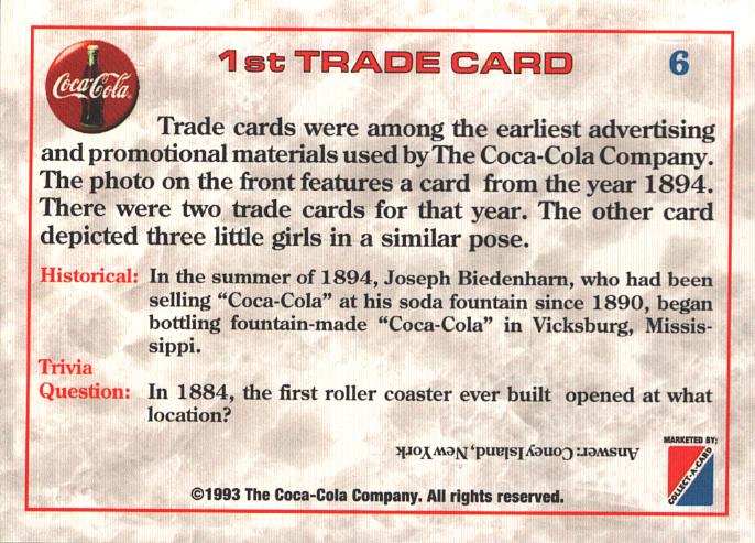 Card Coca-Cola USA n. 6 – 1st. Trade Card 1894 – Trivia Card 1993 ed. Marketed