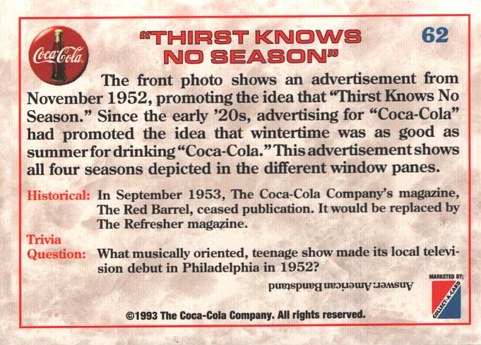 | Titolo: | Card Coca-Cola USA n. 62 – Thirst knows no season 1952 – Trivia Card 1993 ed. Marketed |