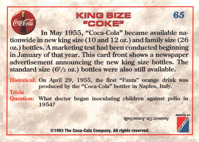 | Titolo: | Card Coca-Cola USA n. 65 – King Size Coke 1955 – Trivia Card 1993 ed. Marketed |