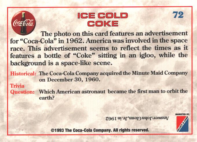 | Titolo: | Card Coca-Cola USA n. 72 – Ice Cold Coke 1962 – Trivia Card 1993 ed. Marketed |