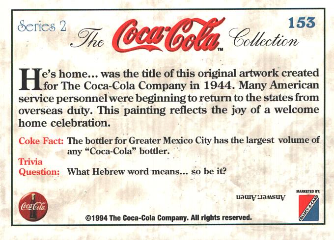 | Titolo: | Card The Coca-Cola Collection – Series 2 USA n. 153 – Trivia Card 1994 ed. Marketed |