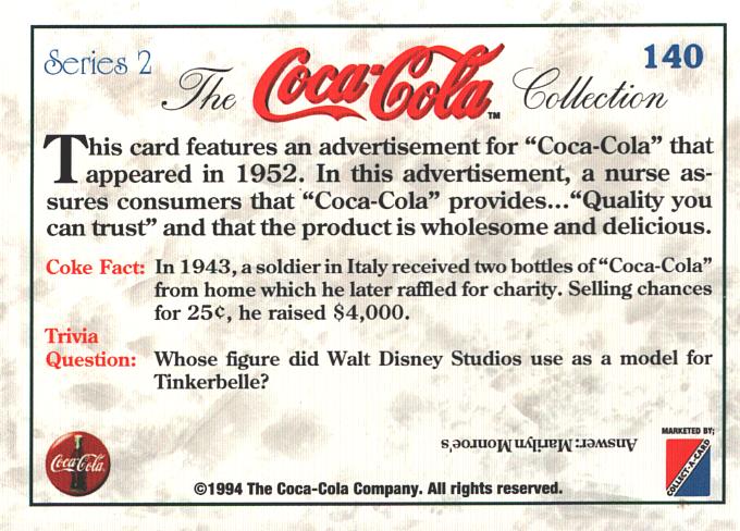 | Titolo: | Card The Coca-Cola Collection – Series 2 USA n. 140 – Trivia Card 1994 ed. Marketed |