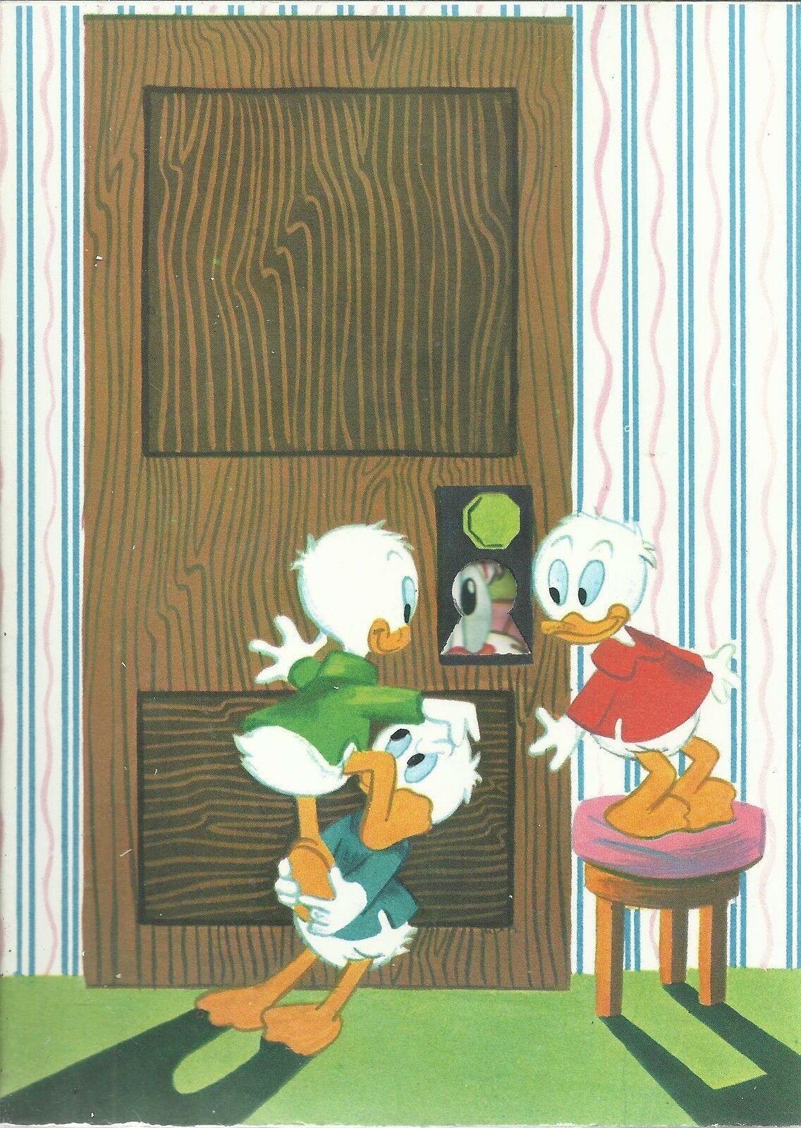 Cartoncino di auguri originale Diseny del 1962. Cartoncino ripiegato in quattro parti, con Paperino vestito da Babbo Natale dietro la serratura. |