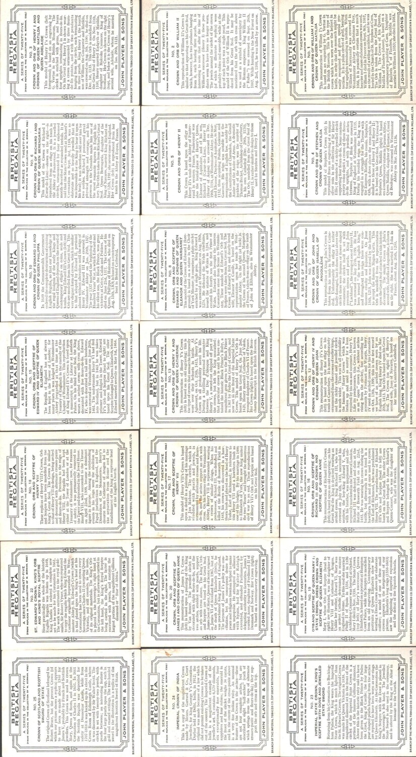 | Titolo: | British Regalia – Lotto 21 figurine cards – 1937 ed. John Player & Sons England |