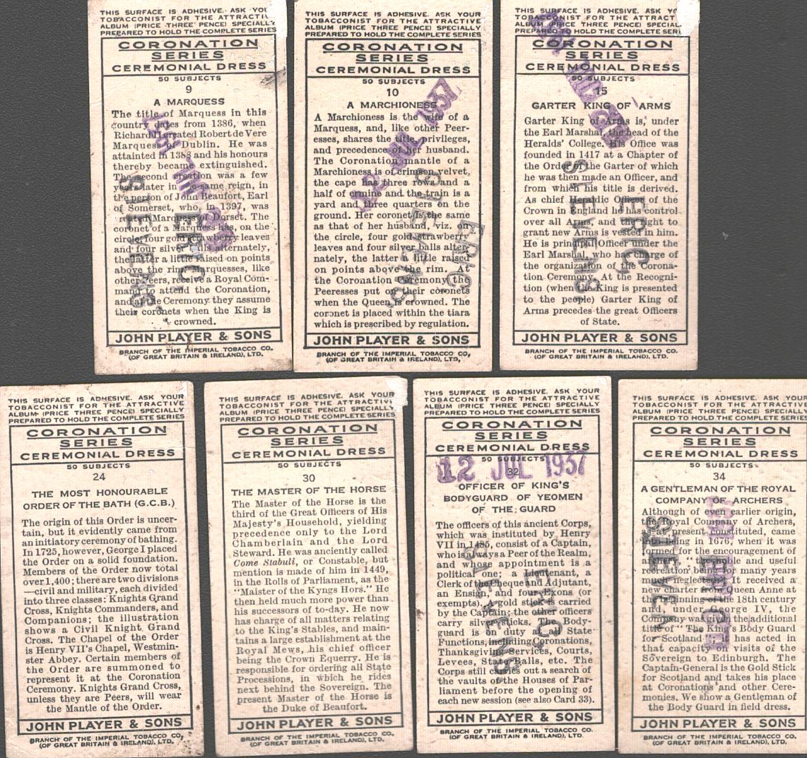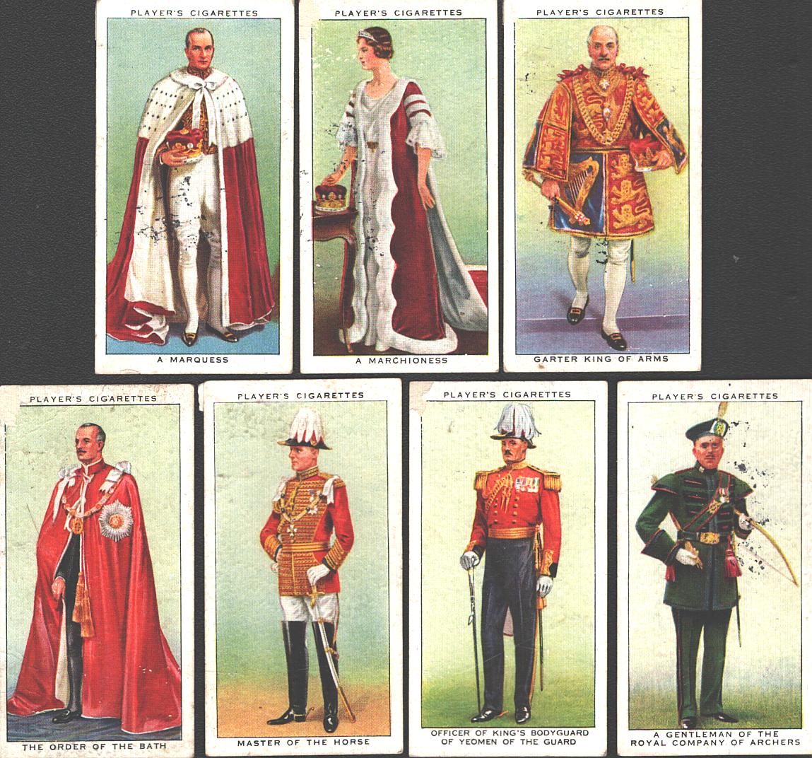 | Titolo: | Coronation Series Ceremonial Dress – Lotto 7 figurine cards anno 1937 ed. John Player & Sons England |