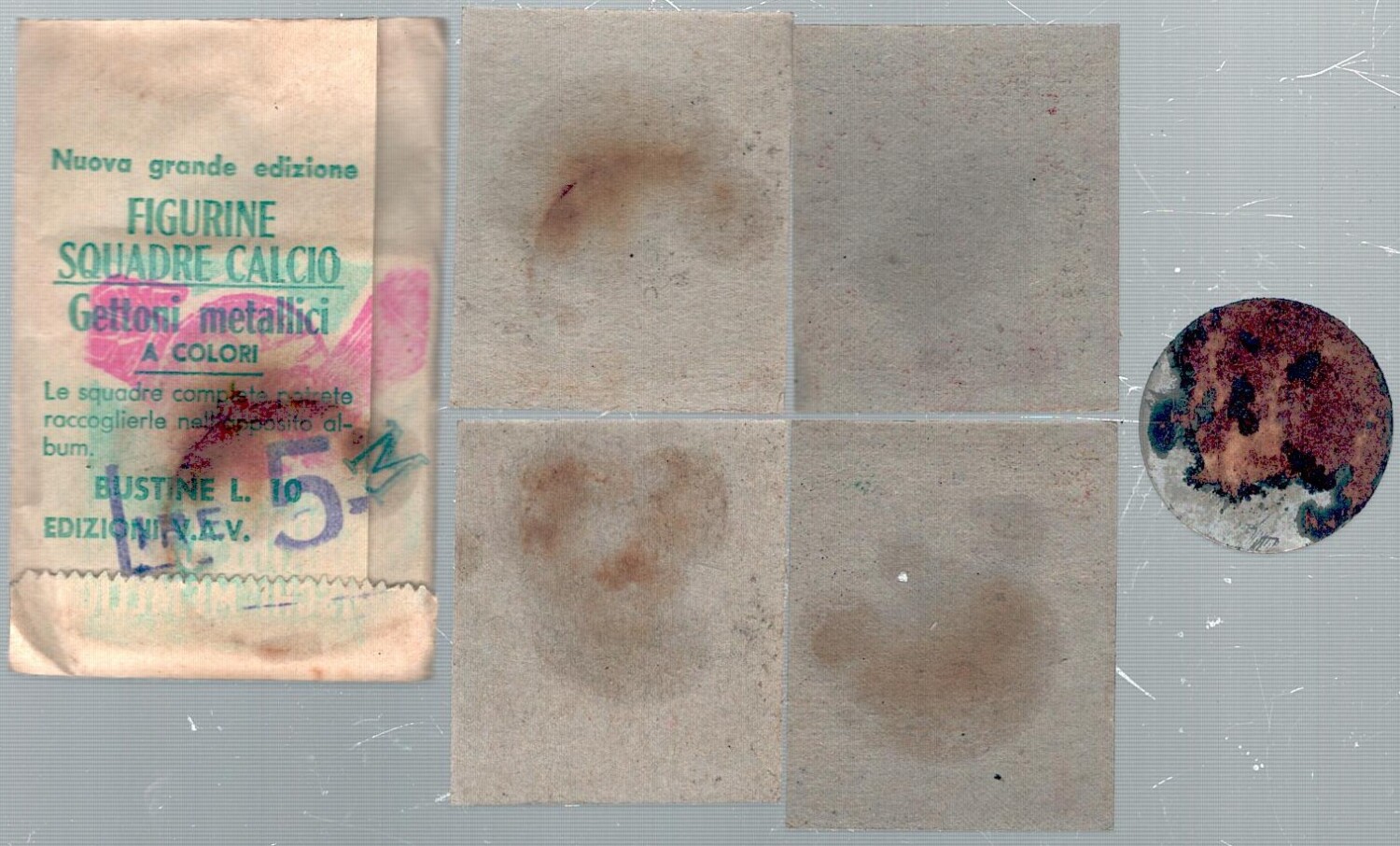 | La bustina è aperta perchè la colla si è seccata, nessuna figurina mancante. Il disco metallico ha rilasciato ruggine sia sul pacchetto che sulle figurine come da immagine allegata. |