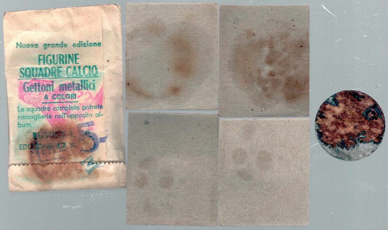 La bustina è aperta perchè la colla si è seccata, nessuna figurina mancante. Il disco metallico ha rilasciato ruggine sia sul pacchetto che sulle figurine come da immagine allegata.