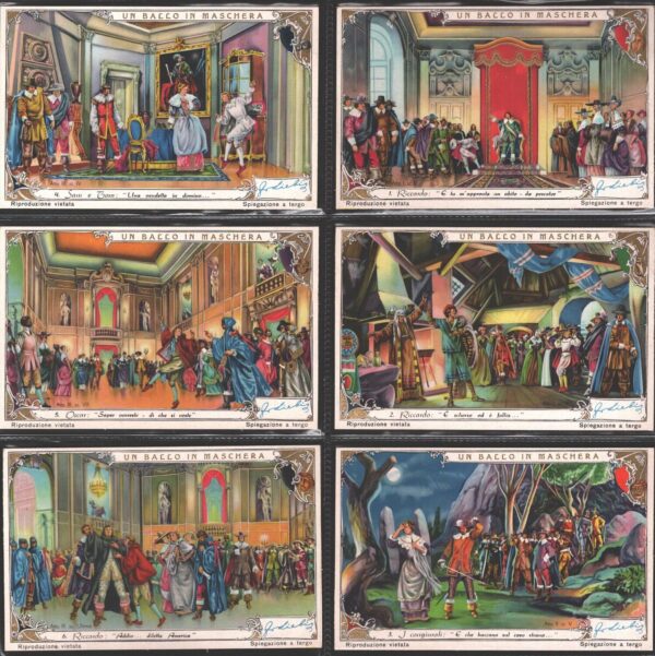 | Titolo: | Figurine Liebig – Serie n. 1541 Completa (6 figurine) – Un ballo in maschera – Edizione Italiana 1952 |