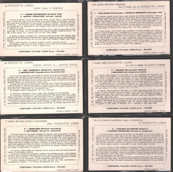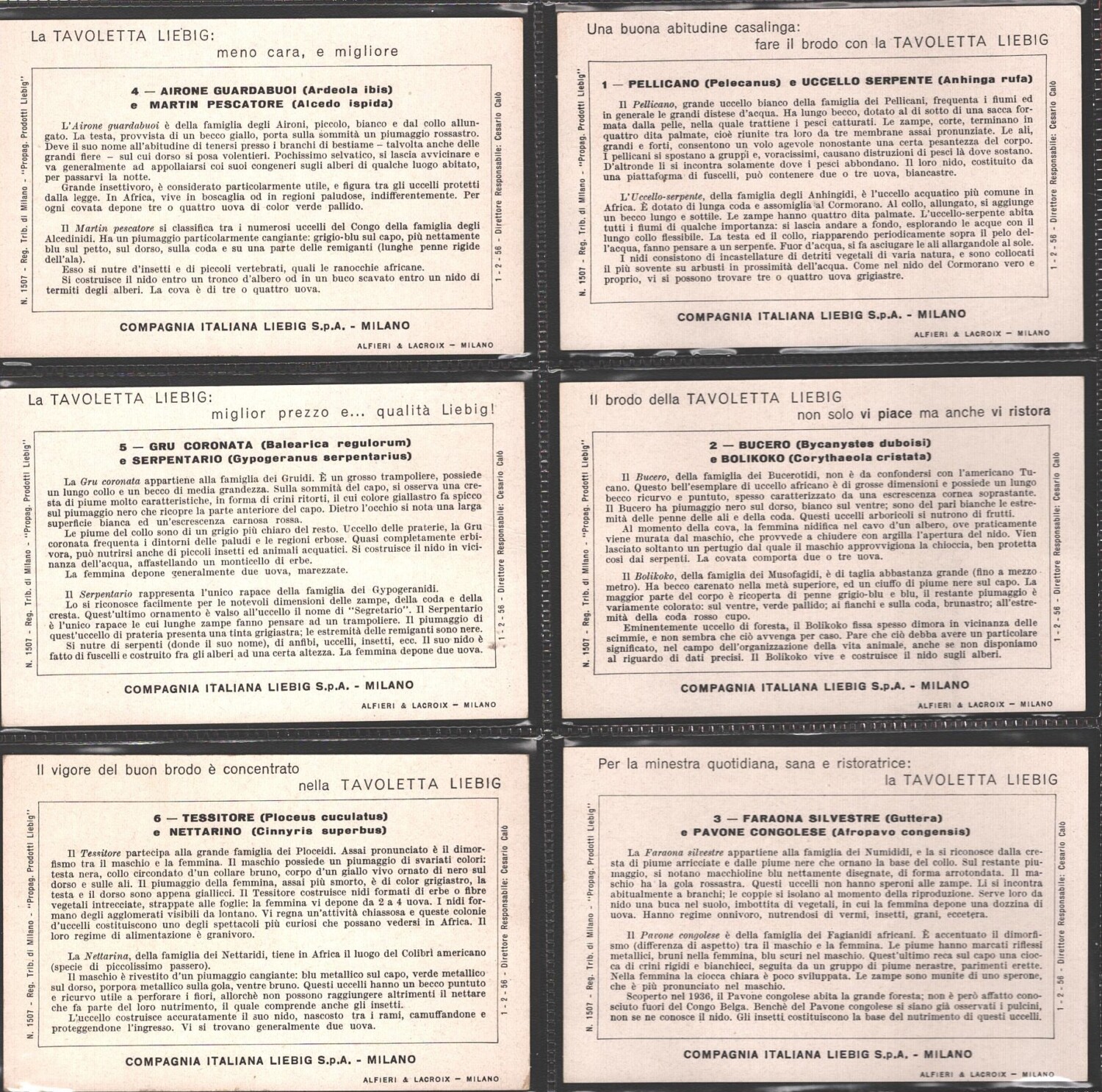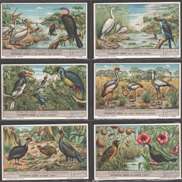 | Titolo: | Figurine Liebig – Serie n. 1632 Completa (6 figurine) – Uccelli del Congo – Edizione Italiana 1956 |