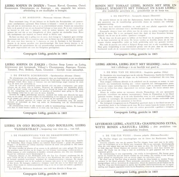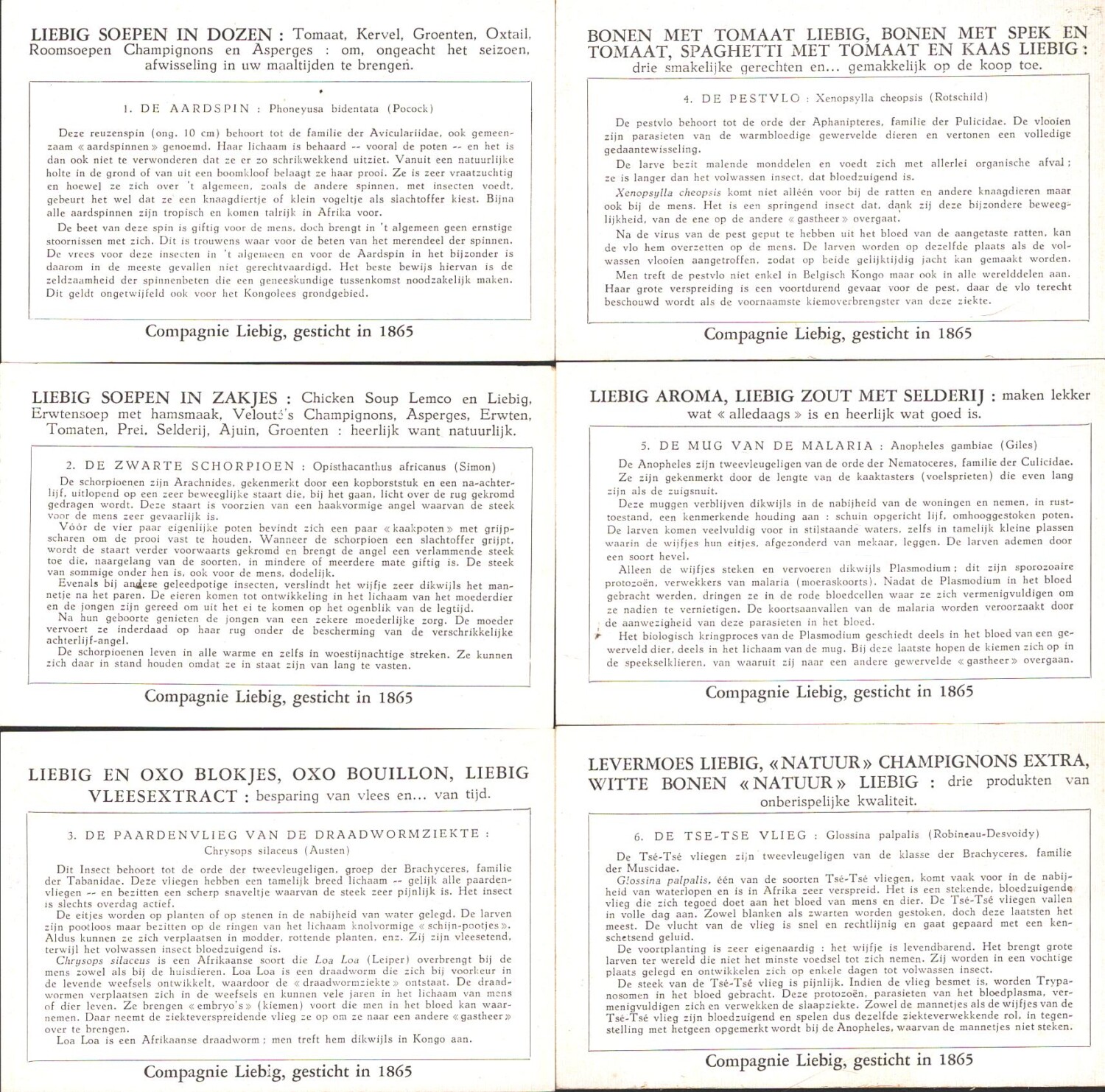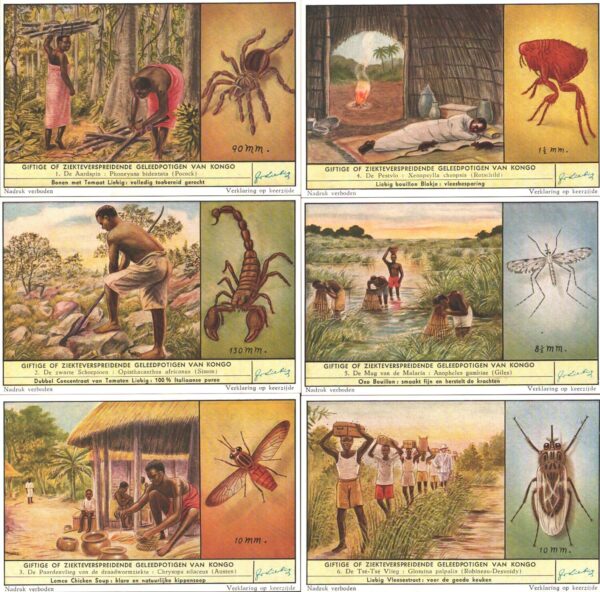 | Titolo: | Figurine Liebig – Serie n. 1637 Completa (6 figurine) – Giftige of Ziekteverspreidende Van Kongo – Edizione Fiamminga 1956 |