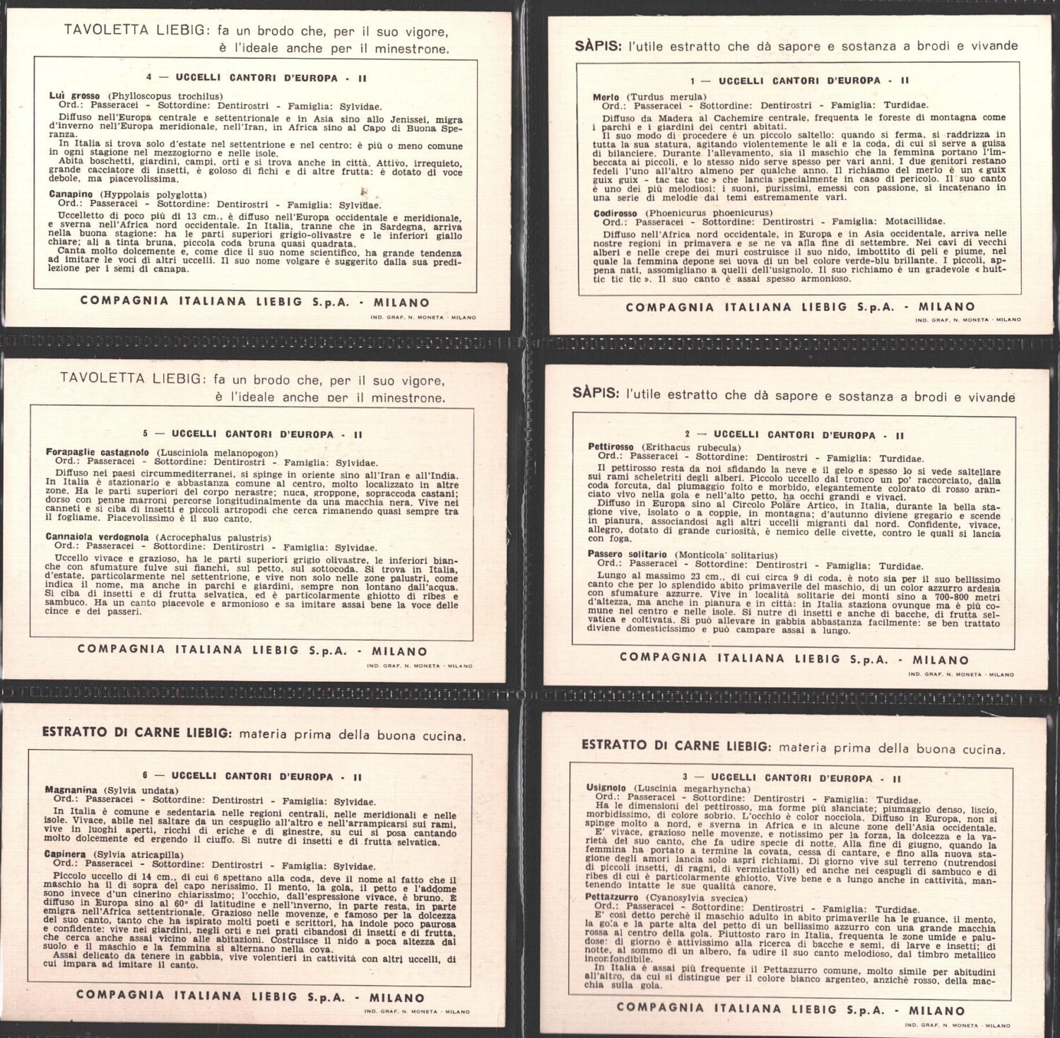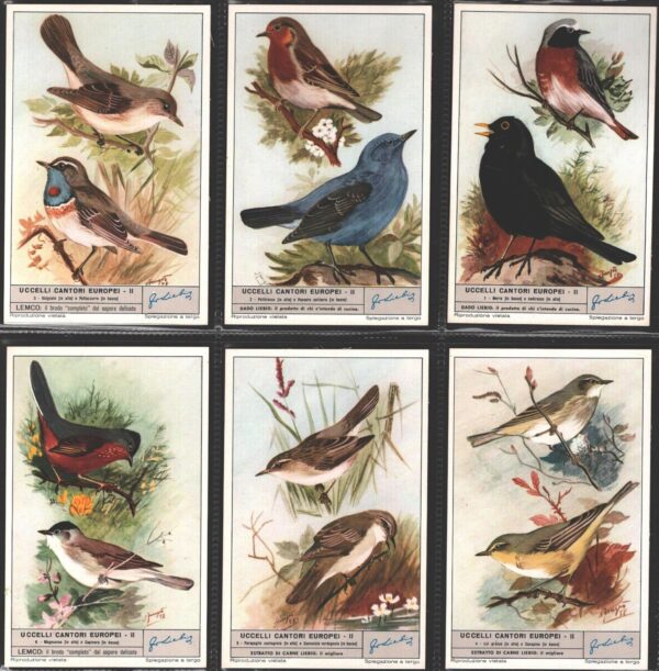 | Titolo: | Figurine Liebig – Serie n. 1771 Completa (6 figurine) – Uccelli cantori europei II – Edizione Italiana 1961 |