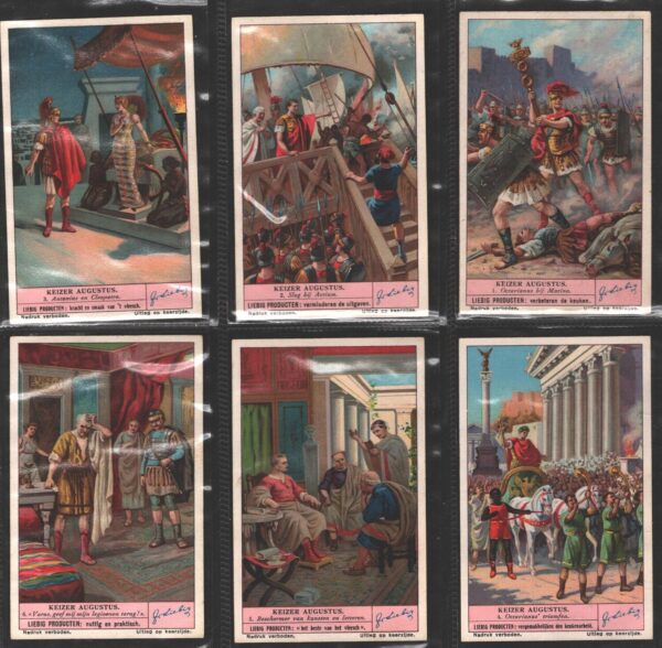 | Titolo: | Figurine Liebig – Serie n. 1391 Completa (6 figurine) – Keizer augustus – Edizione Fiamminga 1939 |