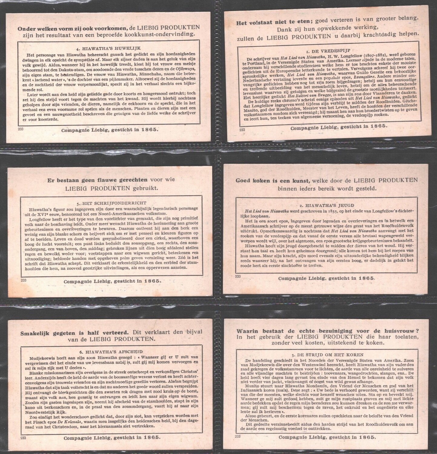 | Titolo: | Figurine Liebig – Serie n. 1465 Completa (6 figurine) – Het lied van hiawatha – Edizione Fiamminga 1948 |