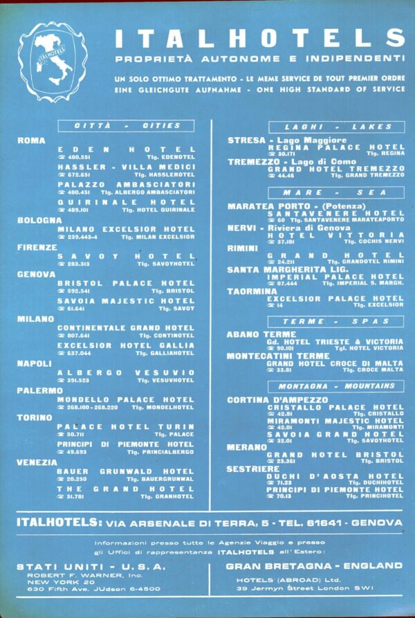 Italhotels – Proprietà Autonome e Indipendenti – Pubblicità su cartoncino
