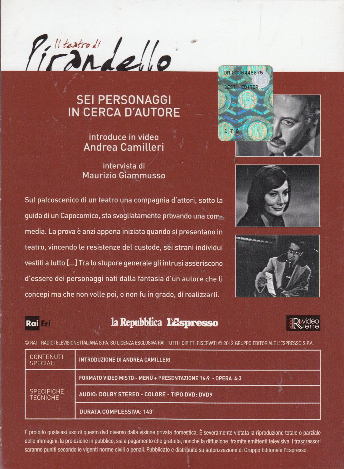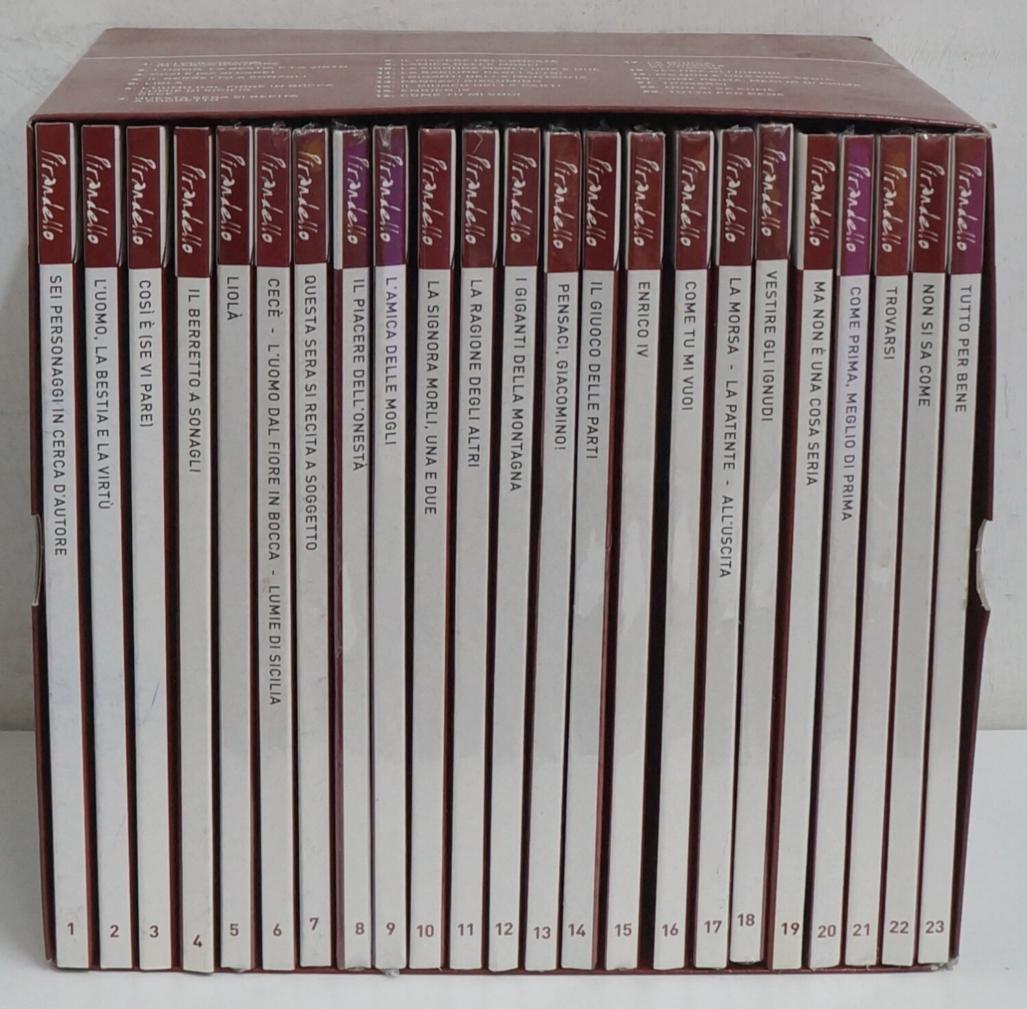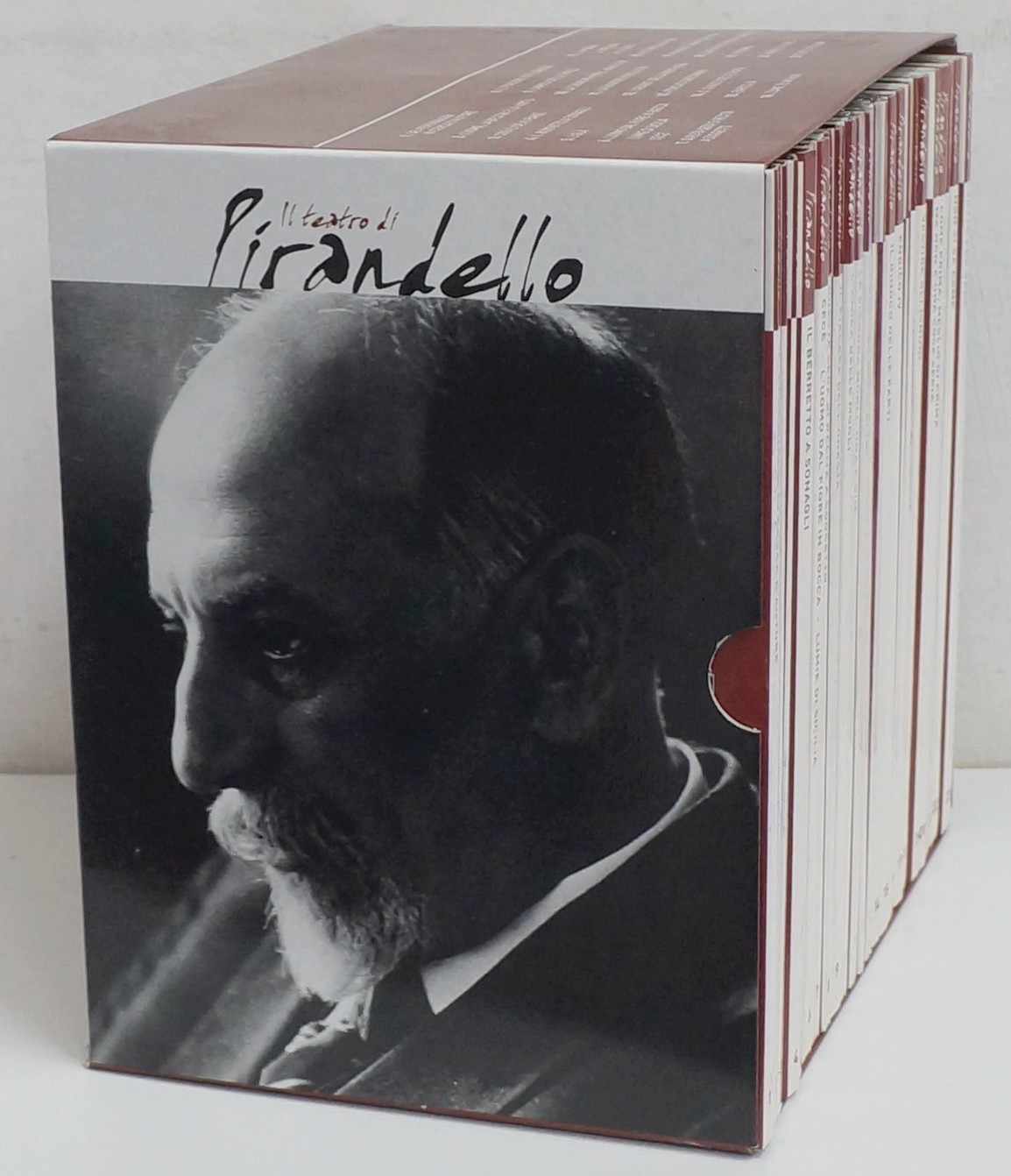 | Descrizione: | I titoli inclusi sono: Sei personaggi in cerca d’autore – L’uomo la bestia e la virtù – Così è (se vi pare) – Il berretto a sonagli – Liolà – Cecè, L’uomo dal fiore in bocca – Questa sera si recita a soggetto – Il piacere dell’onestà – L’amica delle mogli – La signora Morli una e due – La ragione degli altri – I giganti della montagna – Pensaci giacomino! – Il giuoco delle parti – Enrico IV – Come tu mi vuoi – La morsa, La patente, All’uscita – Vestire gli ignudi – Manon è una cosa seria – Come prima meglio di prima – Trovarsi – Non si sa come – Tutto per bene. |