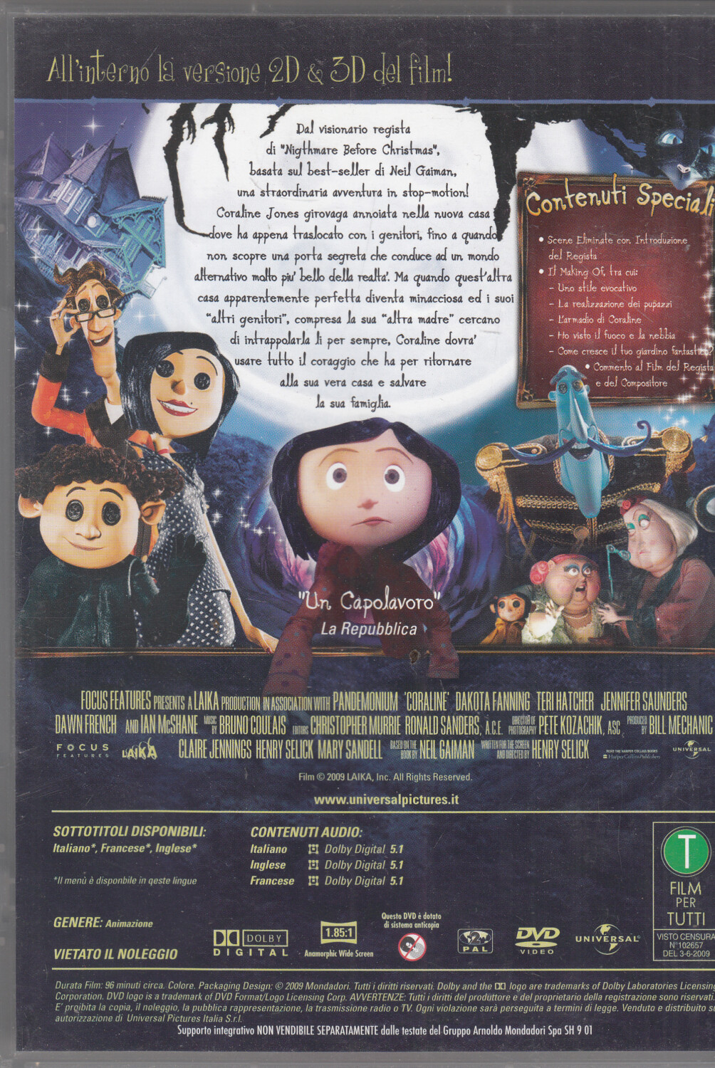 | Titolo: | Coraline e la porta magica. Collector’s Edition con n. 2 DVD (2D e 3D) in Italiano. SENZA Occhialini 3D |