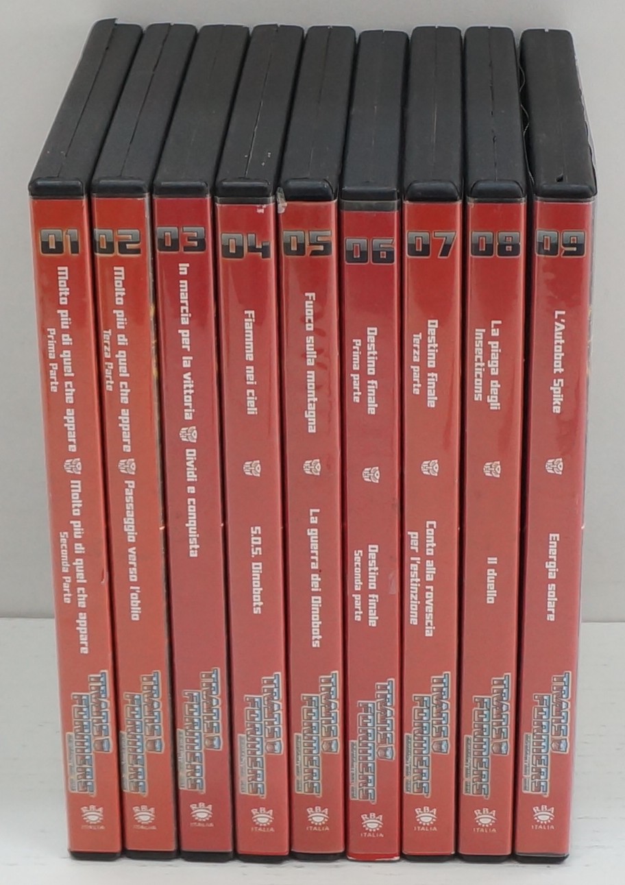 | NOTA BENE: Raccolta NON completa. Sono inclusi i primi 9 DVD (episodi 1-18) della Trasnformers Generation one G1. Versione da edicola. Dischi: Condizioni Buone (Presentano graffi ma sono perfettamente funzionanti) — Custodie: Condizioni Ottime — Libretti non presenti (fogli cartacei interni con i dati del DVD). Versione da edicola. |