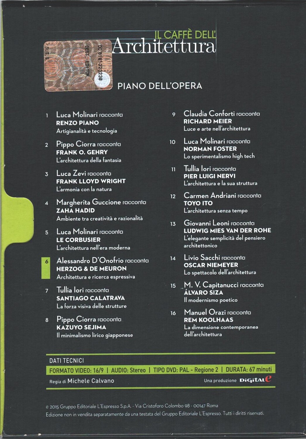 | Titolo: | Alessandro D’Onofrio racconta Herzog & De Meuron. Il Caffè dell’Architettura vol. 6. Versione da edicola. DVD in Italiano. |