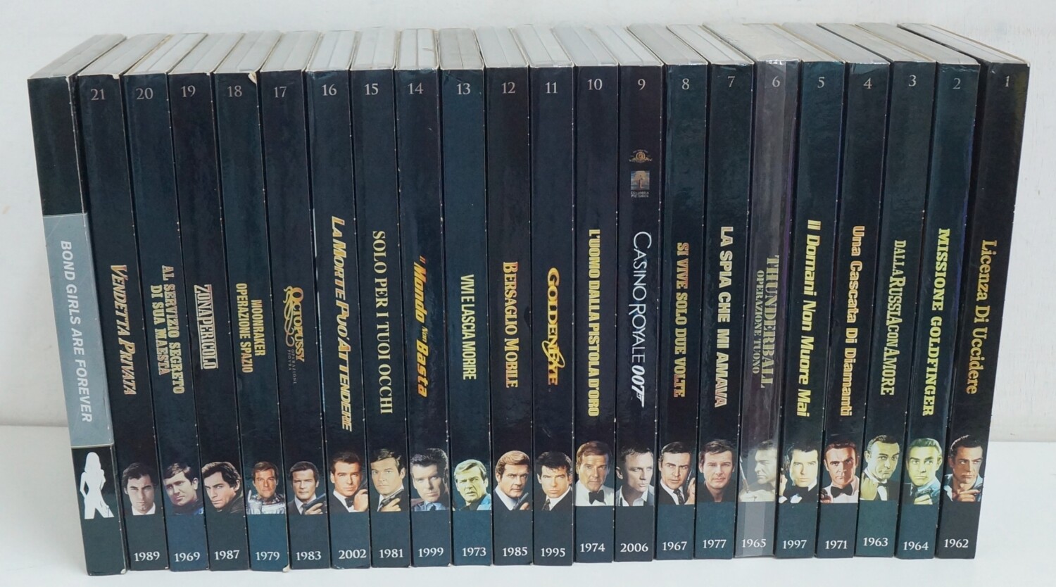 | Descrizione: | I titoli inclusi sono: Licenza di uccidere, Missione Goldfinger, Dalla Russia con amore, Una cascata di diamanti, Il domani non muore mai, Thunderball operazione Tuono, La spia che mi amava, Si vive solo due volte, Casino Royale, L’uomo dalla pistola d’oro, Goldeneye, Bersaglio mobile, Vivi e lascia morire, Il mondo non basta, Solo per i tuoi occhi, La morte può attendere, Octopussy operazione Piovra, Moonraker operazione Spazio, Zona pericolo, Al servizio segreto di sua maestà, Vendetta privata, Bond girls are forever. |
