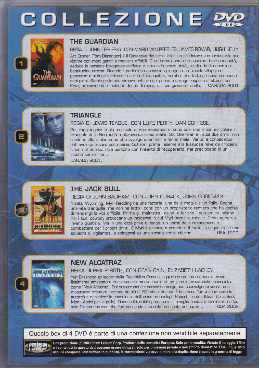 | Titolo: | Collezione (2 DVD) 4 Film – The Guardian, Triangle, The Jack Bull, New Alcatraz – Versione da edicola – DVD in Italiano |