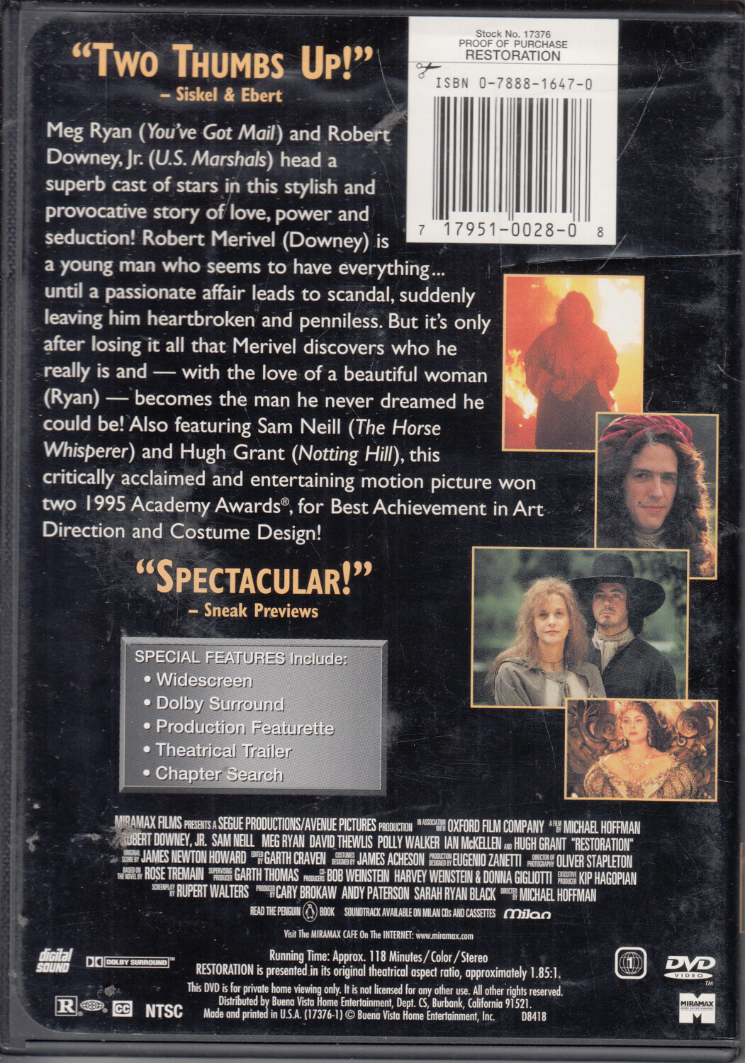 | Titolo: | Restoration – Robert Downey Jr. DVD (Edizione Stati Uniti) – NTSC (Audio in Inglese) |