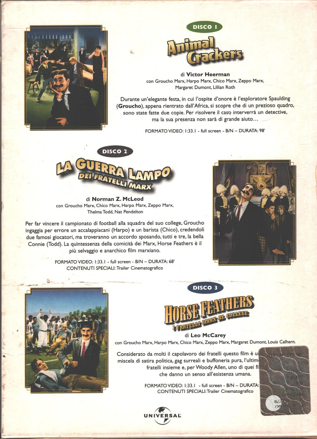 | Descrizione: | I film inclusi sono: Animal Crackers – La guerra lampo dei fratelli Marx – Horse feathers. |