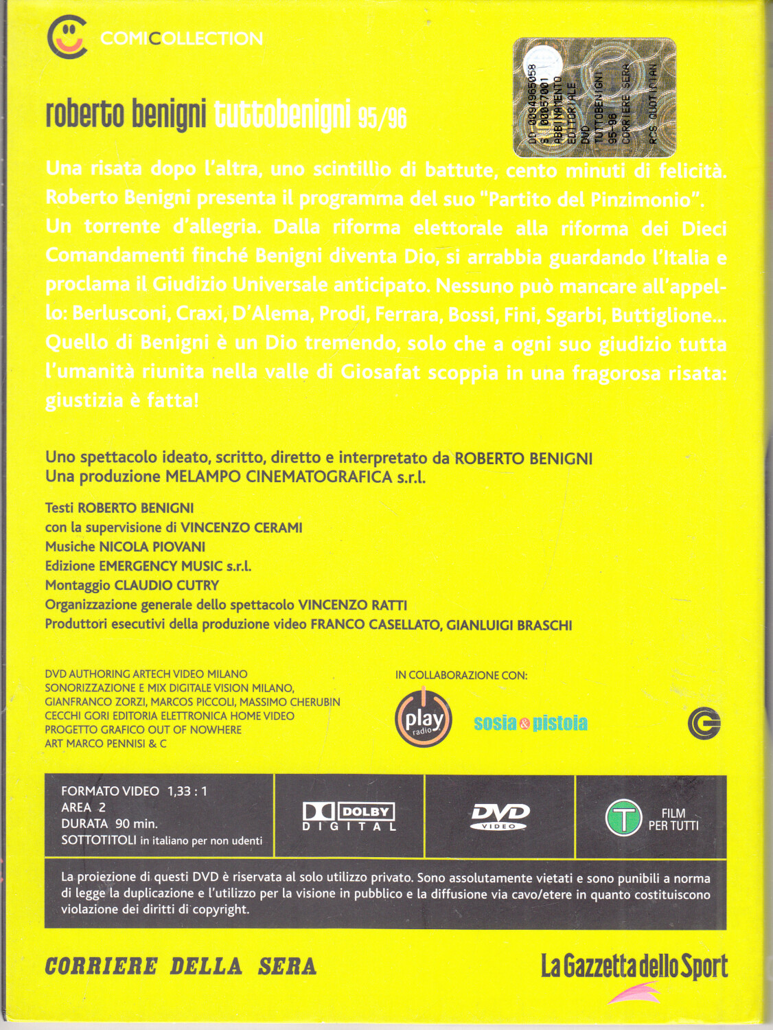 | Titolo: | Tutto Benigni 95/96 – Roberto Benigni. Comicollection vol. 2. DVD in Italiano. Versione da edicola |