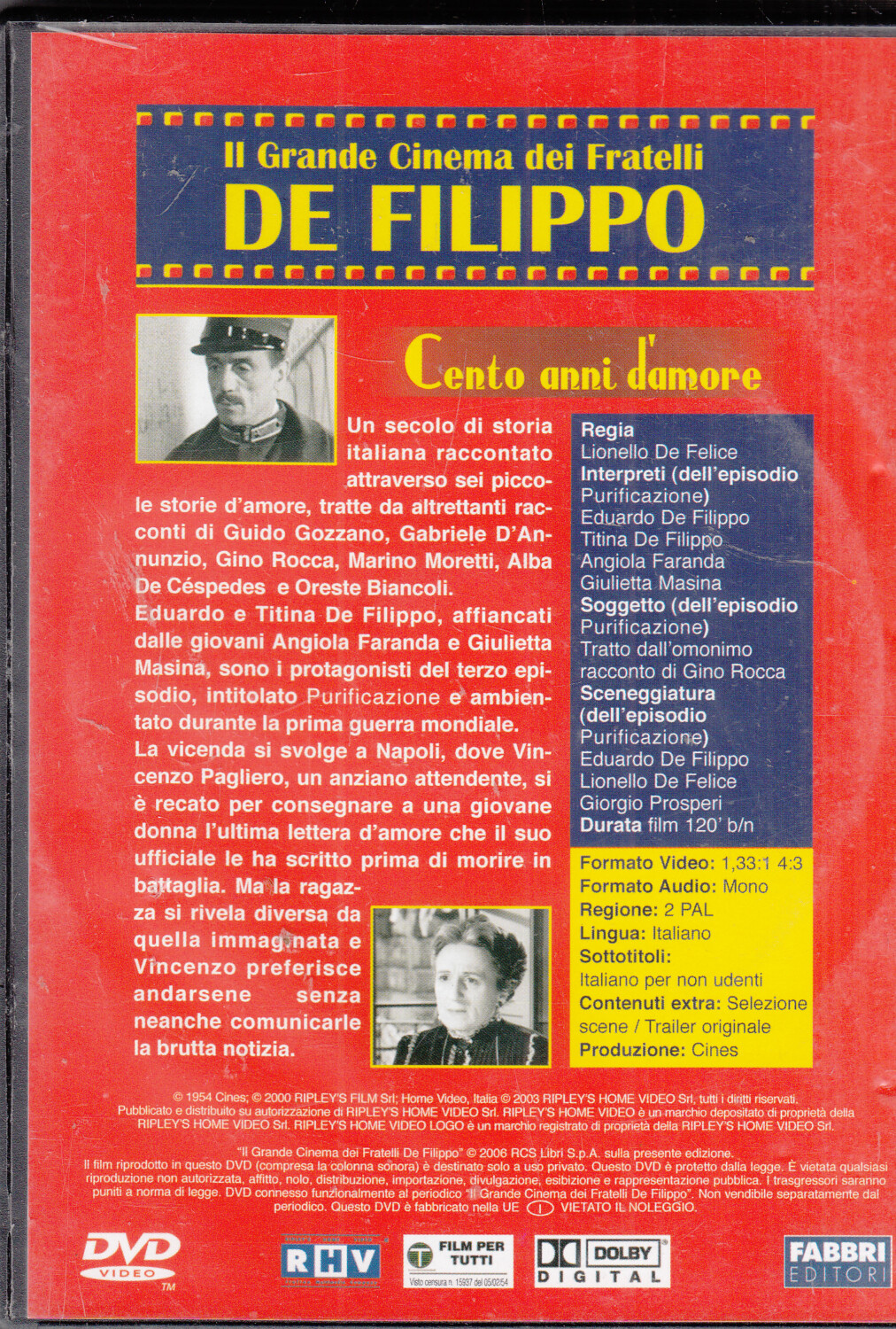 | Titolo: | Cento anni d’amore- DVD Il Grande Cinema dei Fratelli De Filippo – Versione da edicola – DVD in Italiano |