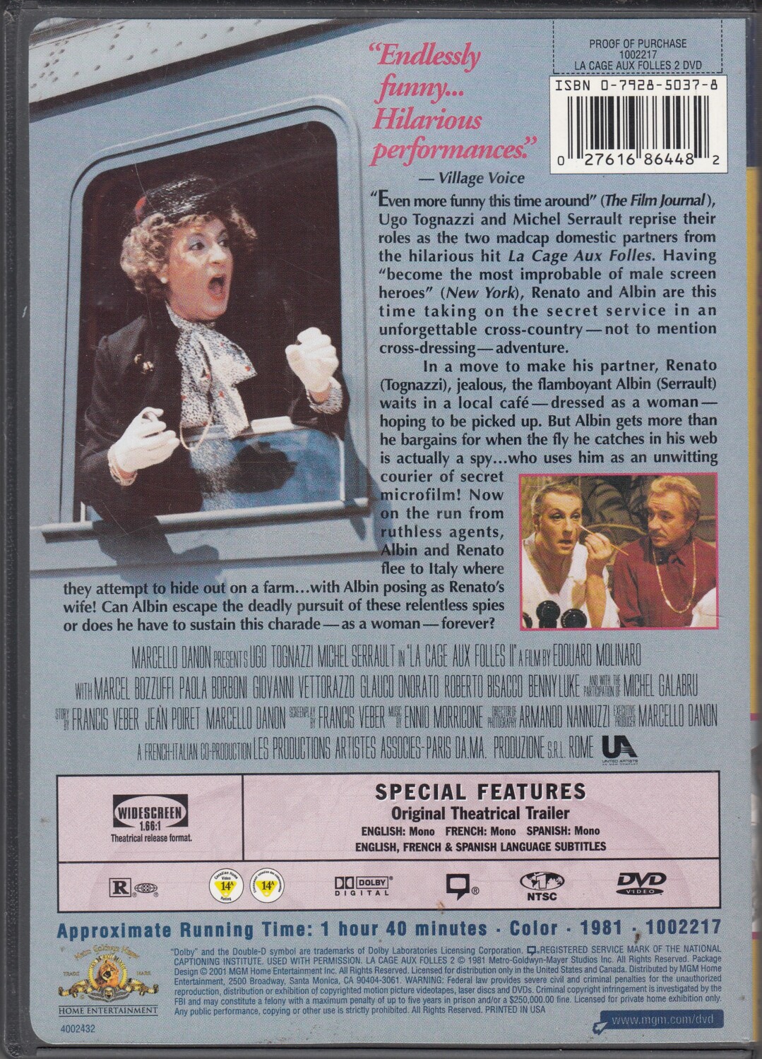 | Titolo: | La Cage aux Folles 2 con Ugo Tognazzi. DVD Edizione Stati Uniti NTSC Regione 1, Lingua Inglese |