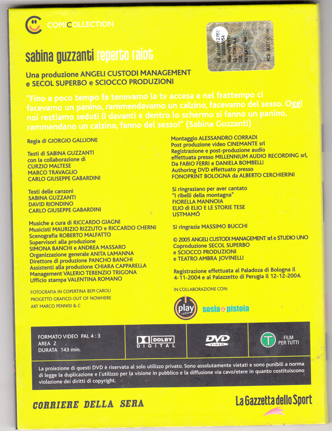 | Titolo: | Reperto Raiot. Sabina Guzzanti DVD in Italiano Versione da edicola |