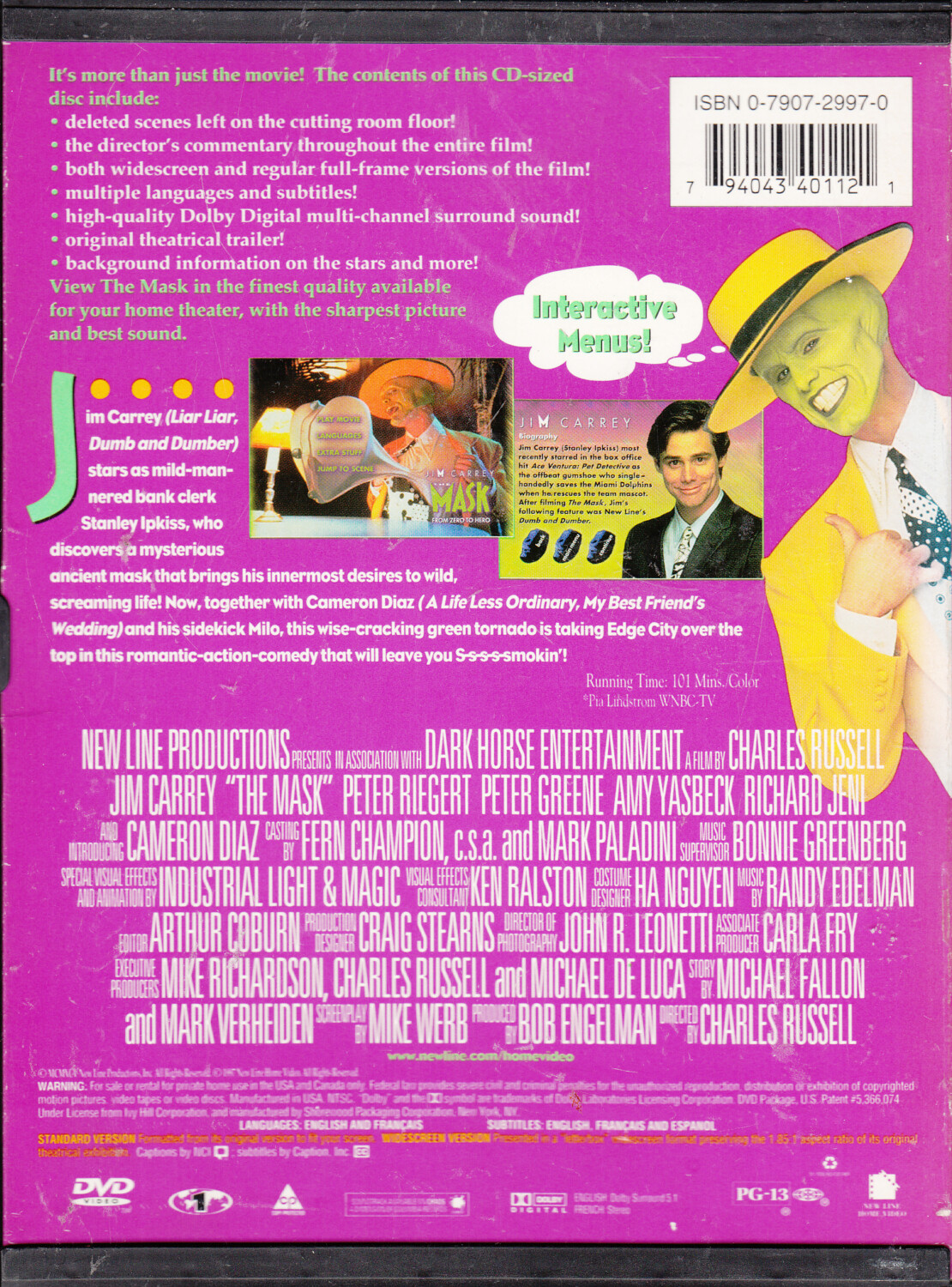 | Titolo: | The Mask un film con Jim Carrey. DVD Edizione Stati Uniti NTSC Regione 1, Lingua Inglese. Custodia Snapper |