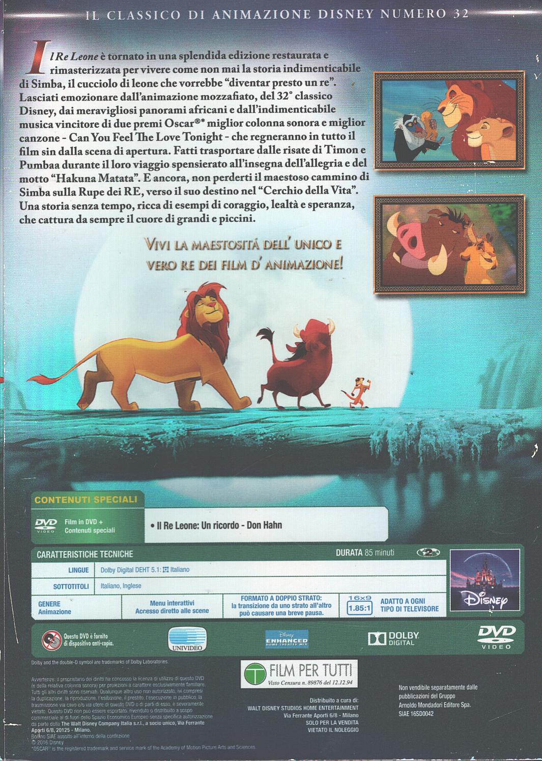 Il Re Leone – DVD Classici Disney n. 32 – Con Slipcase – Versione da edicola – DVD in Italiano – Senza Ologramma