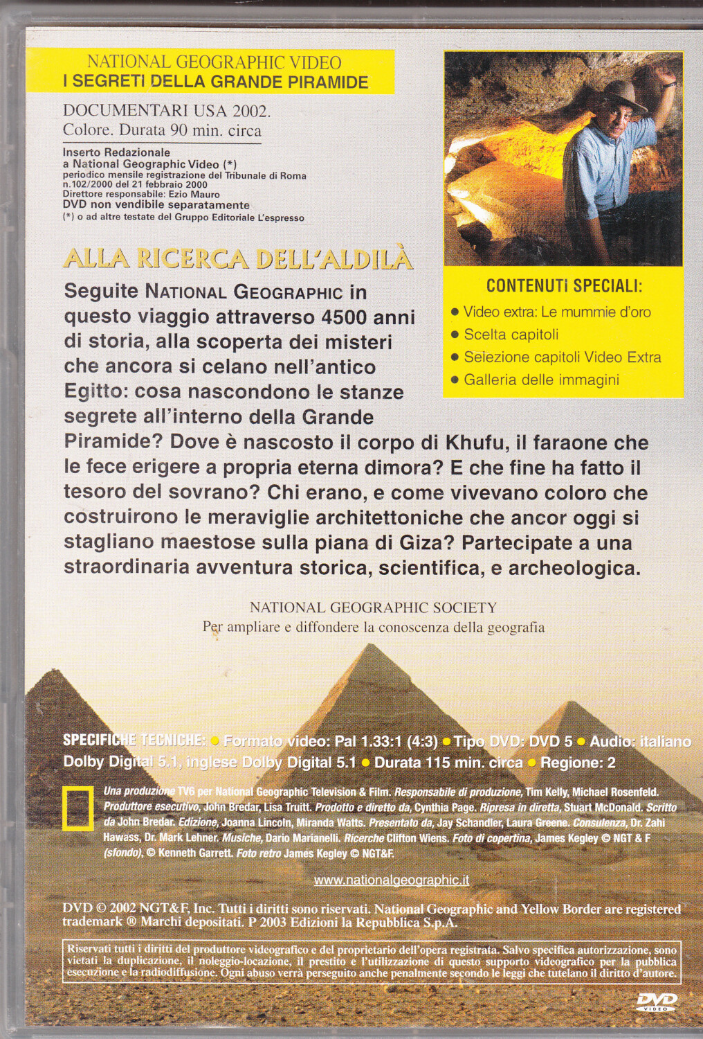 | Titolo: | Segreti della Grande Piramide vol. 1. National Geographic. DVD in Italiano. Versione da edicola |