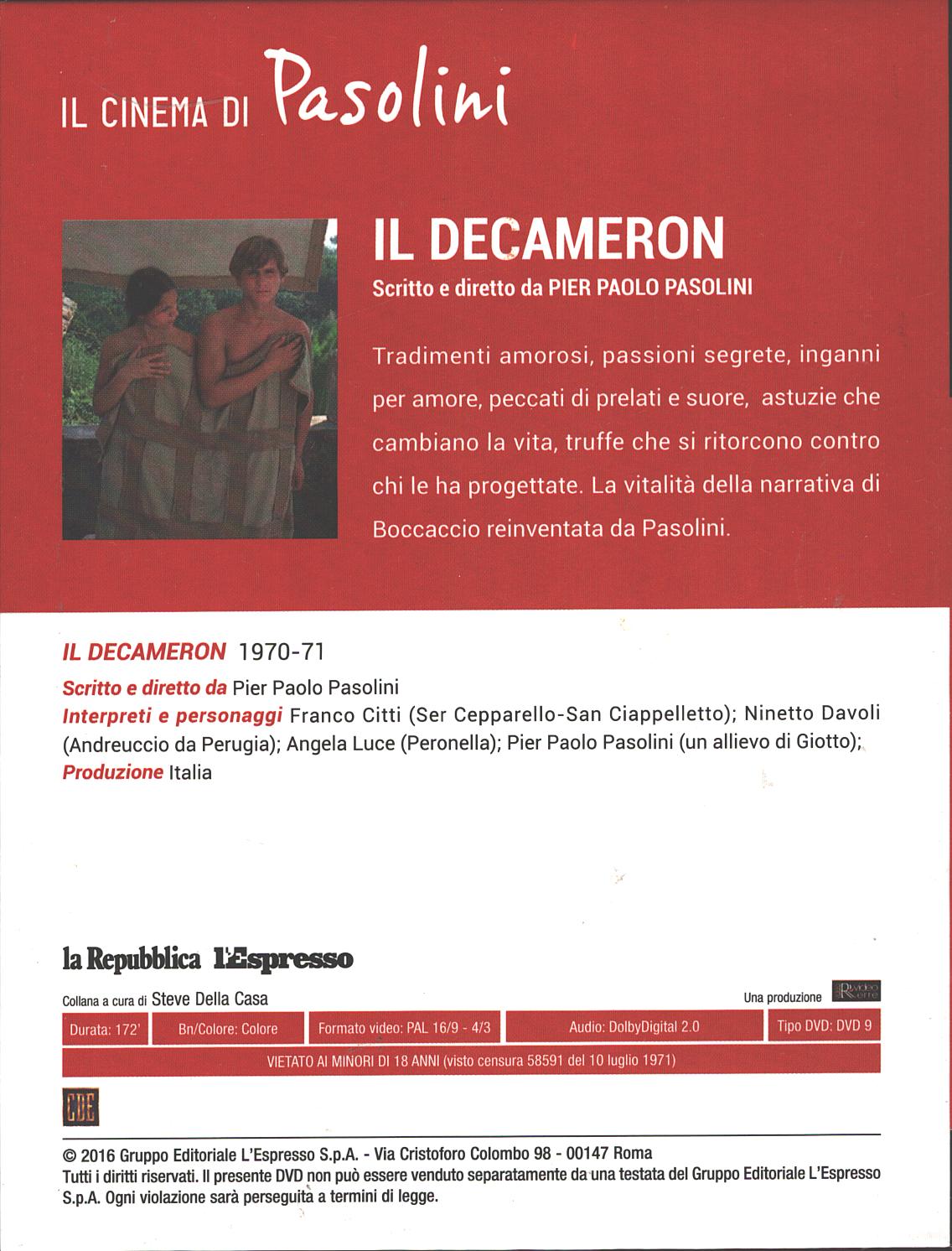 | Descrizione: | I film inclusi sono: Accattone – Mamma Roma – Il vangelo secondo Matteo – Il Decameron – I racconti di Canterbury – Il fiore delle Mille e una Notte – Uccellacci e uccellini – Teorema – Porcile – Edipo Re – Medea – Ro.Go.Pa.G. – Salò o le 120 giornate di Sodoma – La rabbia – Appunti per un’orestiade Africana – Comizi d’amore – La commare secca – Storie scellerate – La voce di Pasolini. |