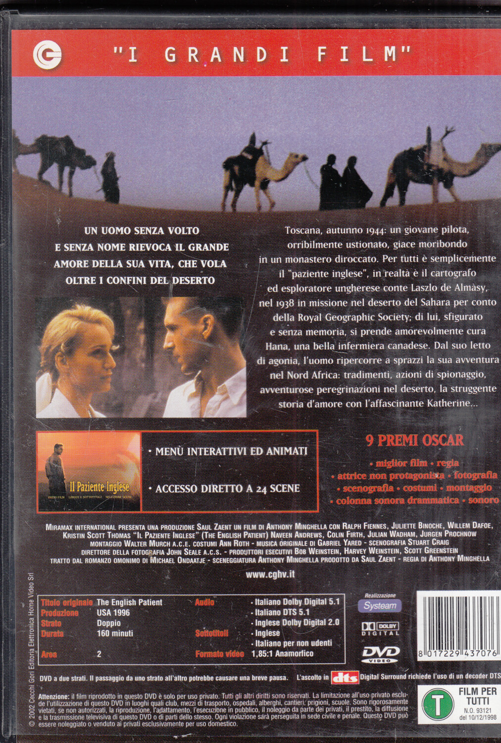 | Titolo: | Il paziente Inglese un film di Anthony Minghella. I Grandi Film. DVD in Italiano ed. |